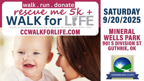 As hard as it is to believe, a year has passed since last year’s Crossroads Clinic’s Annual Walk for Life fundraiser. The next walk is scheduled for Saturday, Sept 20, at Mineral Wells Park in Guthrie. So, let’s step up and out for the unborn and support Crossroads in their vital ministry. See Amy Bachelor or visit https://ccwalkforlife.com/ for more information.